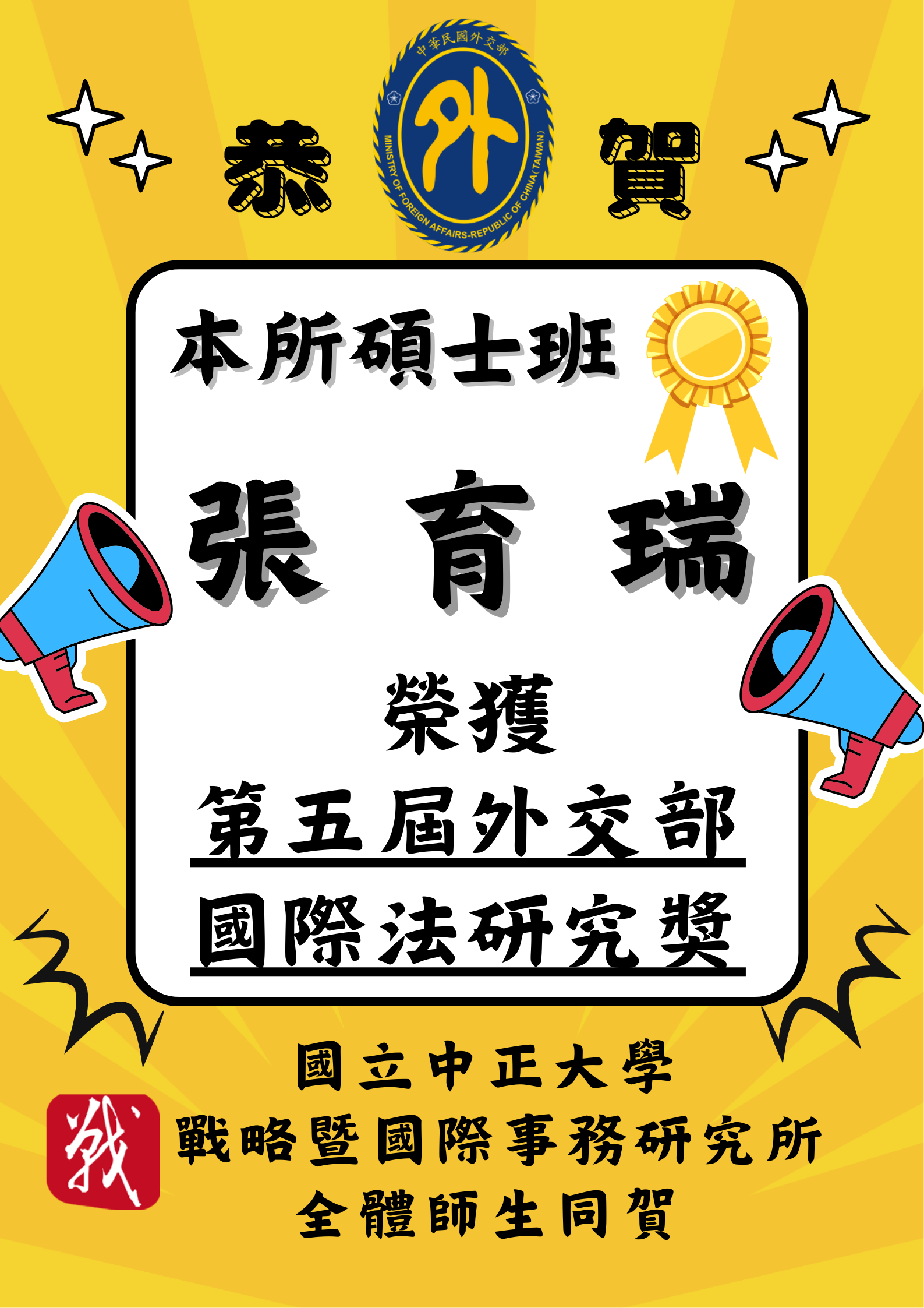 恭賀 本所碩士班學生 張育瑞 榮獲「第五屆外交部國際法研究獎」