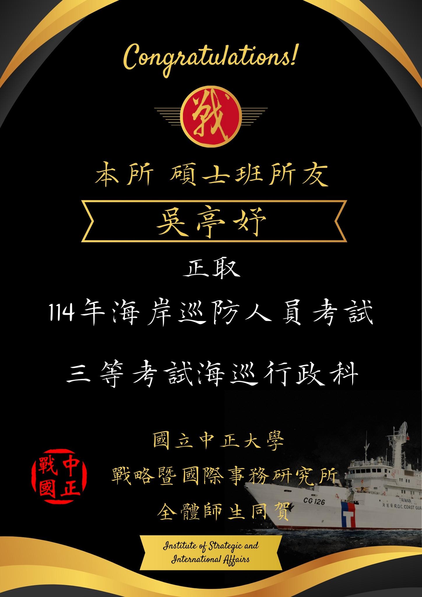 恭賀 本所碩士班所友 吳亭妤 正取「114年海岸巡防人員考試 三等考試海巡行政科」
